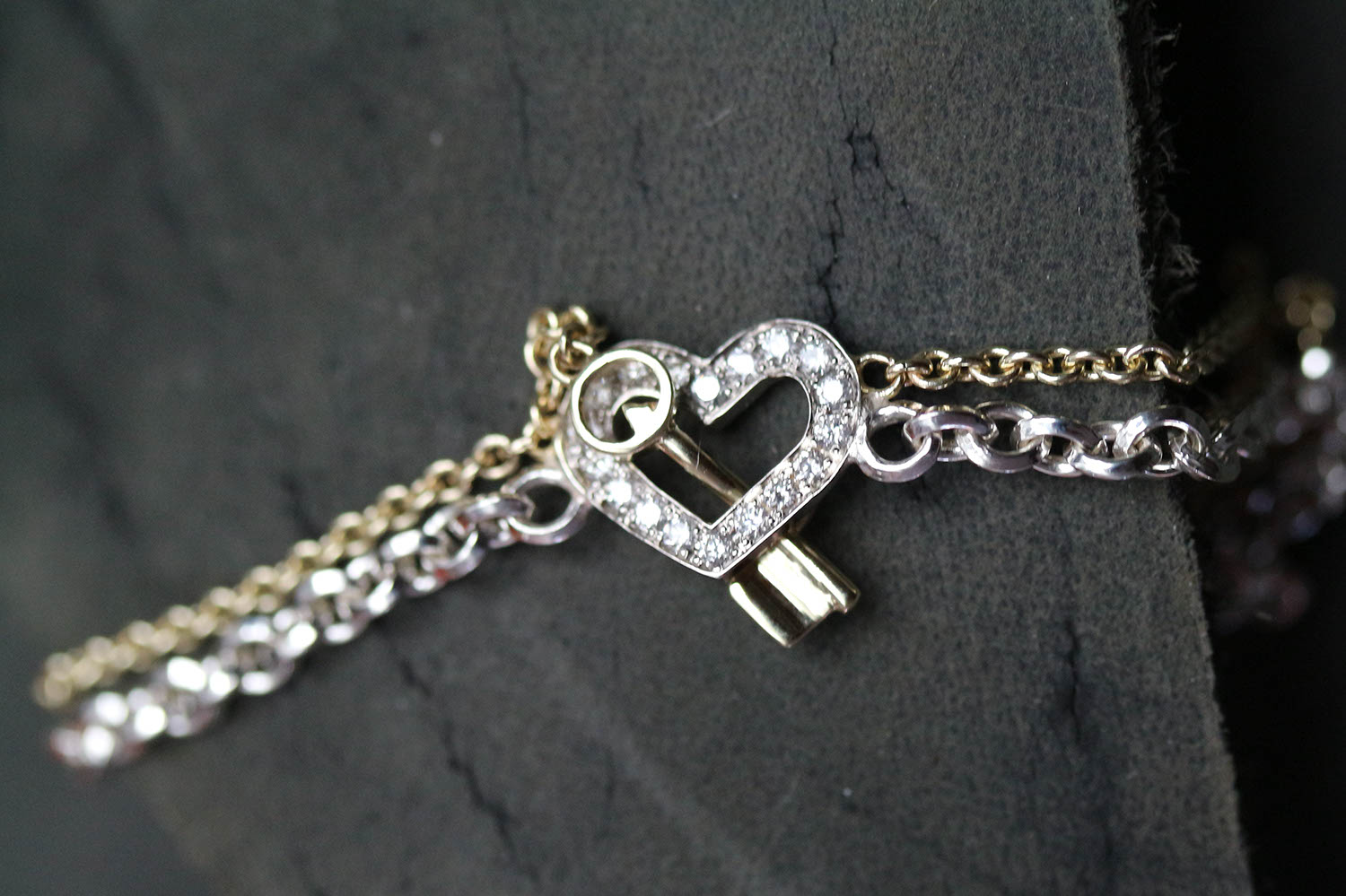 Nach einer Empfehlung ihres Sohnes Markus kam sie auf uns zu. Gemeinsam sind wir auf den Gedanken gekommen, dass ein Schlüssel zum Herzen sehr passend wäre. In das Herz haben wir 18 Brillianten eingesetzt, da die Zahl 18 eine wichtige Bedeutung für unsere Kundin hat.