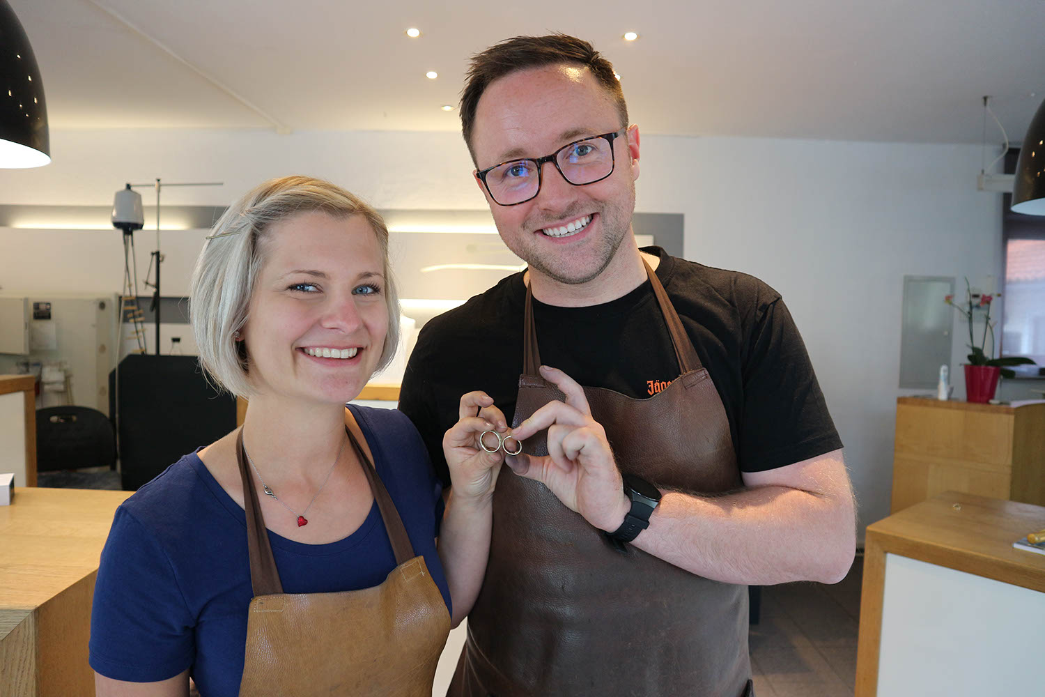 Michaela und Markus fertigen sich gegenseitig ihre Eheringe.